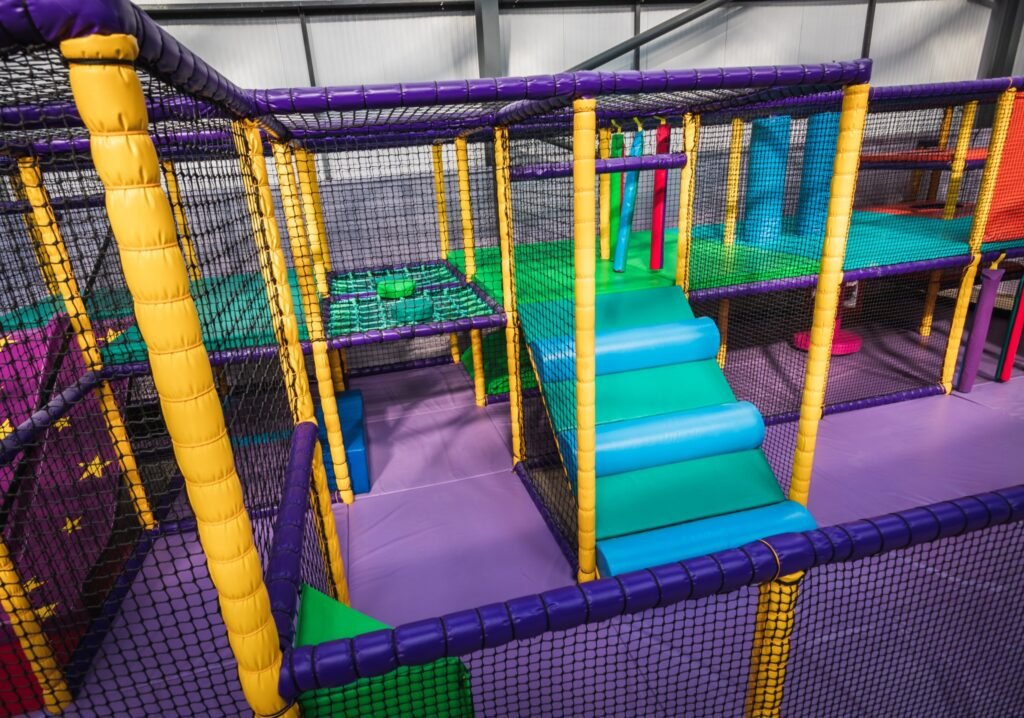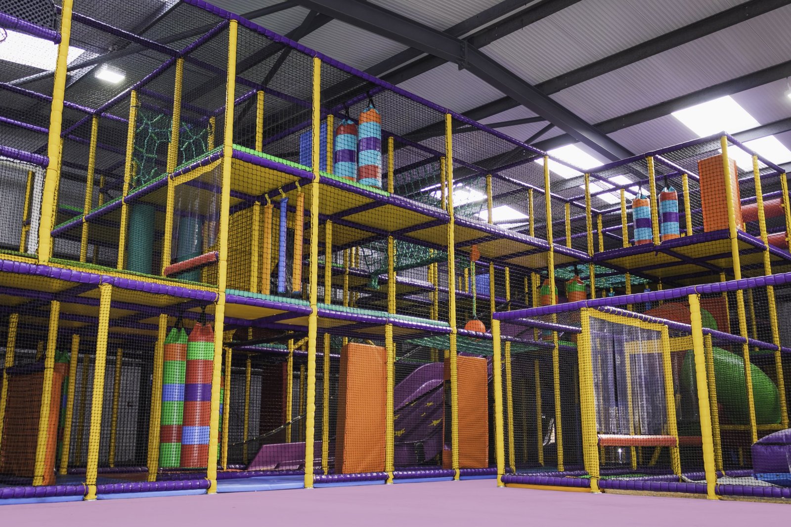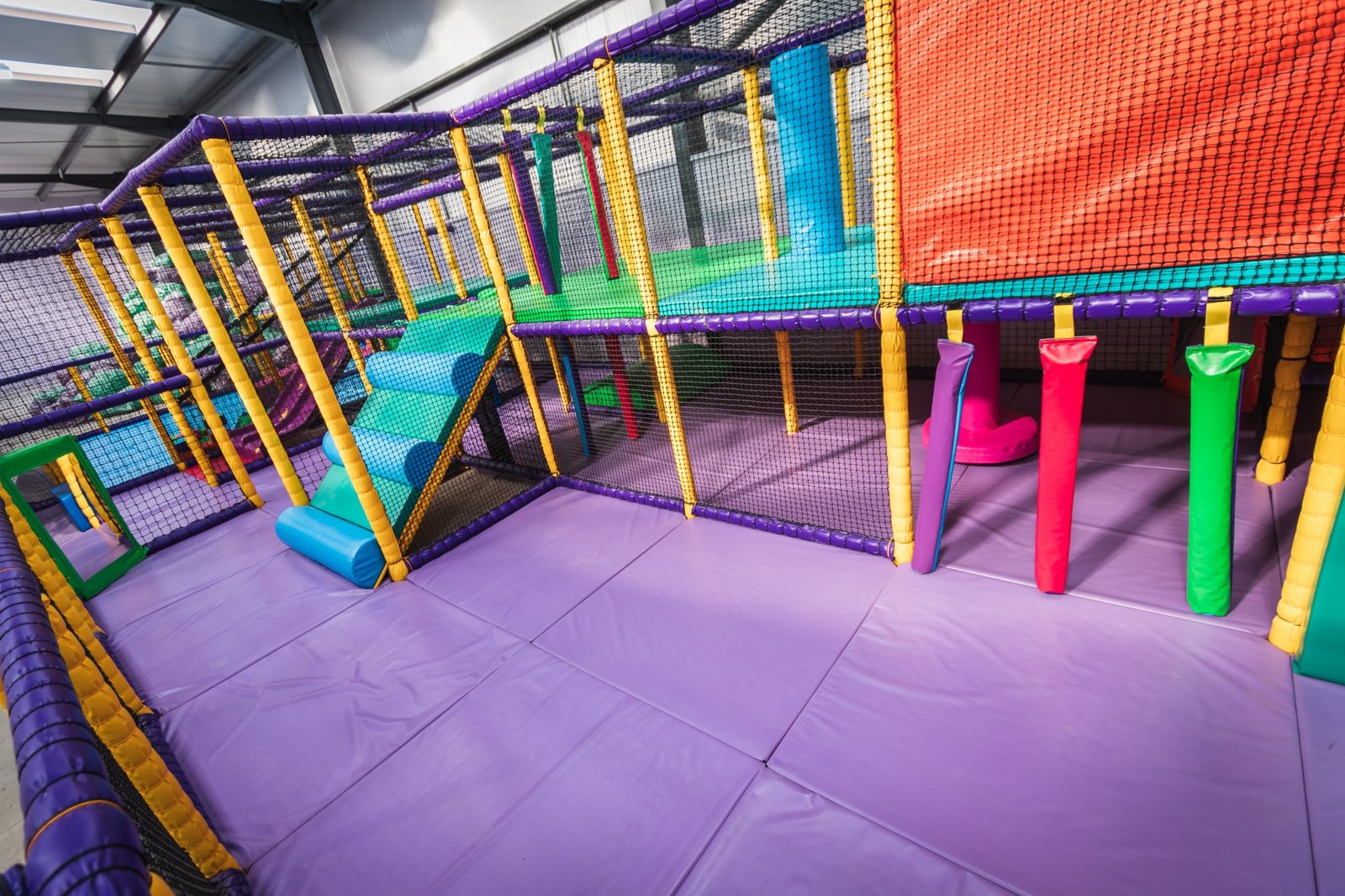 There’s not much that we didn’t do on this job. We installed an astra slide, a drop slide and a spiral slide within the main frame for older children. There are rollers, bash bags, climbing walls, spider webs and tunnels too. We even added a football pitch and jelly mountain for good measure. Toddlers and babies have plenty of opportunities for rolling, crawling, sliding and squeezing too. With games, mirrors, ball pools and hanging snakes, little ones can explore and stimulate their senses as they go. Like I said, there’s not much we didn’t do.